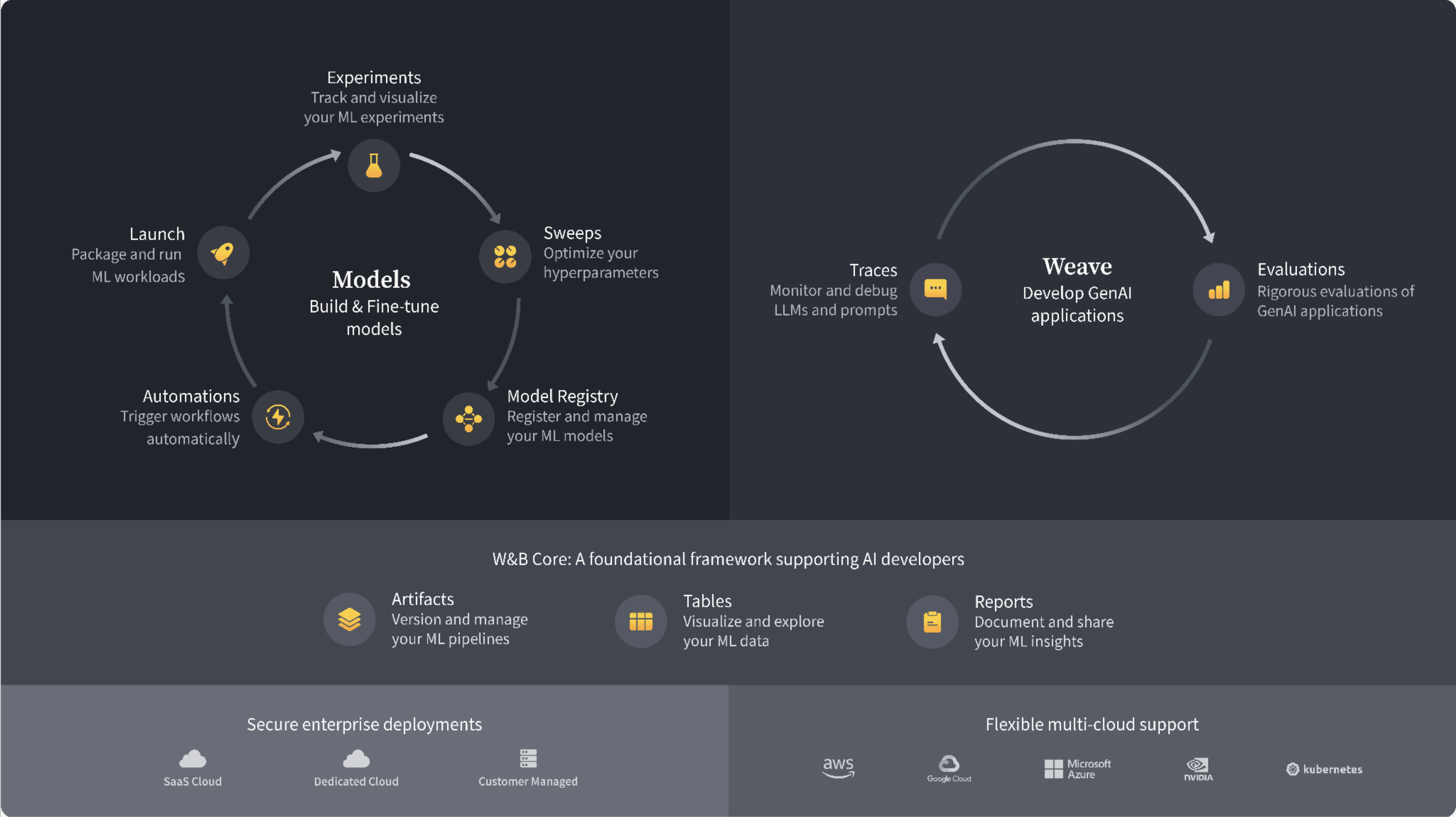 Weights & Biases (W&B) はAI開発者向けプラットフォームで、モデルのトレーニング、ファインチューニング、そして基盤モデルの活用のためのツールを提供します。