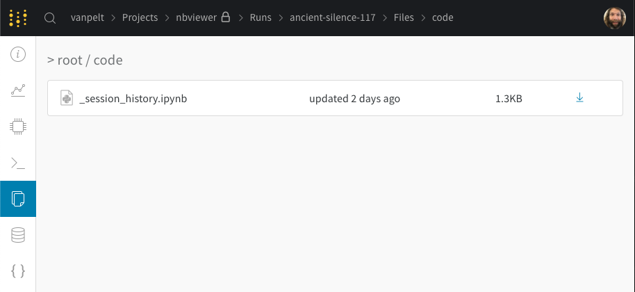 wandb バージョン 0.8.34 から、当社のライブラリはJupyterセッションの保存を行います。Jupyter内で wandb.init() を呼び出すと、現在のセッションで実行されたコードの履歴を含むJupyter notebookを自動的に保存するフックを追加します。このセッション履歴は run のファイルブラウザー内のコードディレクトリーに表示されます: