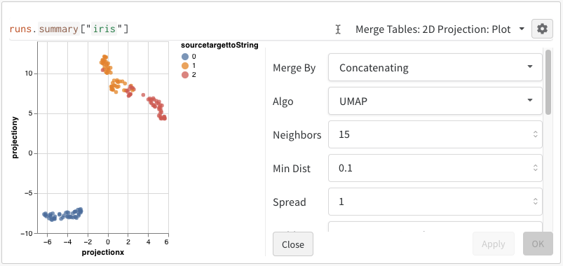 上記のコードを実行した後、再びUIにTableが表示されます。2D Projection を選択すると、Embeddingの定義、カラーリング、アルゴリズム(PCA、UMAP、t-SNE)、アルゴリズムのパラメータ、およびオーバーレイ(この場合、点にホバーしたときに画像が表示されます)の設定ができます。この特定のケースでは、すべて「スマートデフォルト」であり、2D Projection をワンクリックするだけで非常に類似したものを見ることができるはずです。この例を使ってインタラクティブにクリックします。