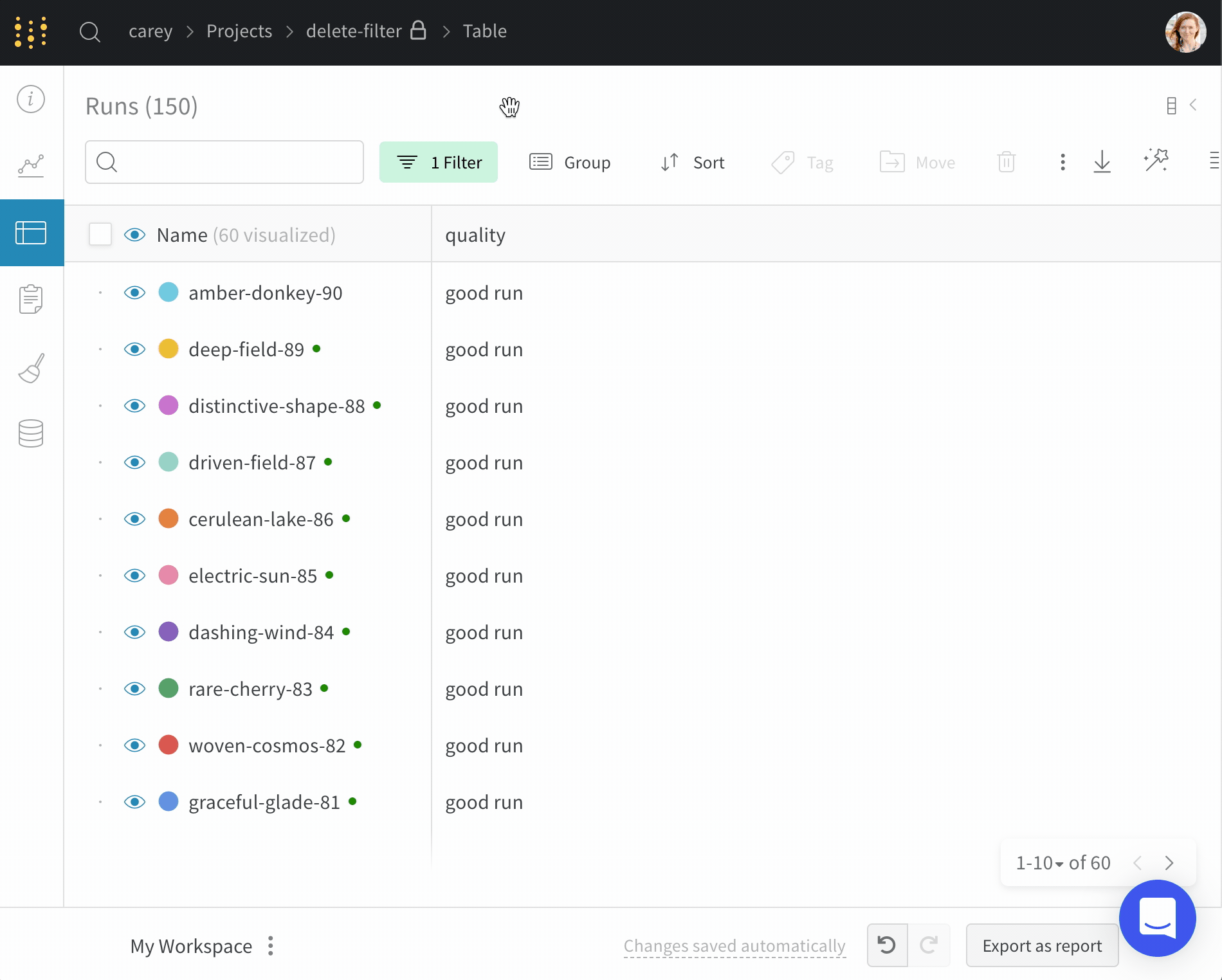 クラッシュした runs を非表示にしますか?短い runs がテーブルを埋めていますか?グループプロジェクト内で自分の作業だけを見たいですか?フィルタを使用してノイズを非表示にできます。以下のフィルタを推奨します:
