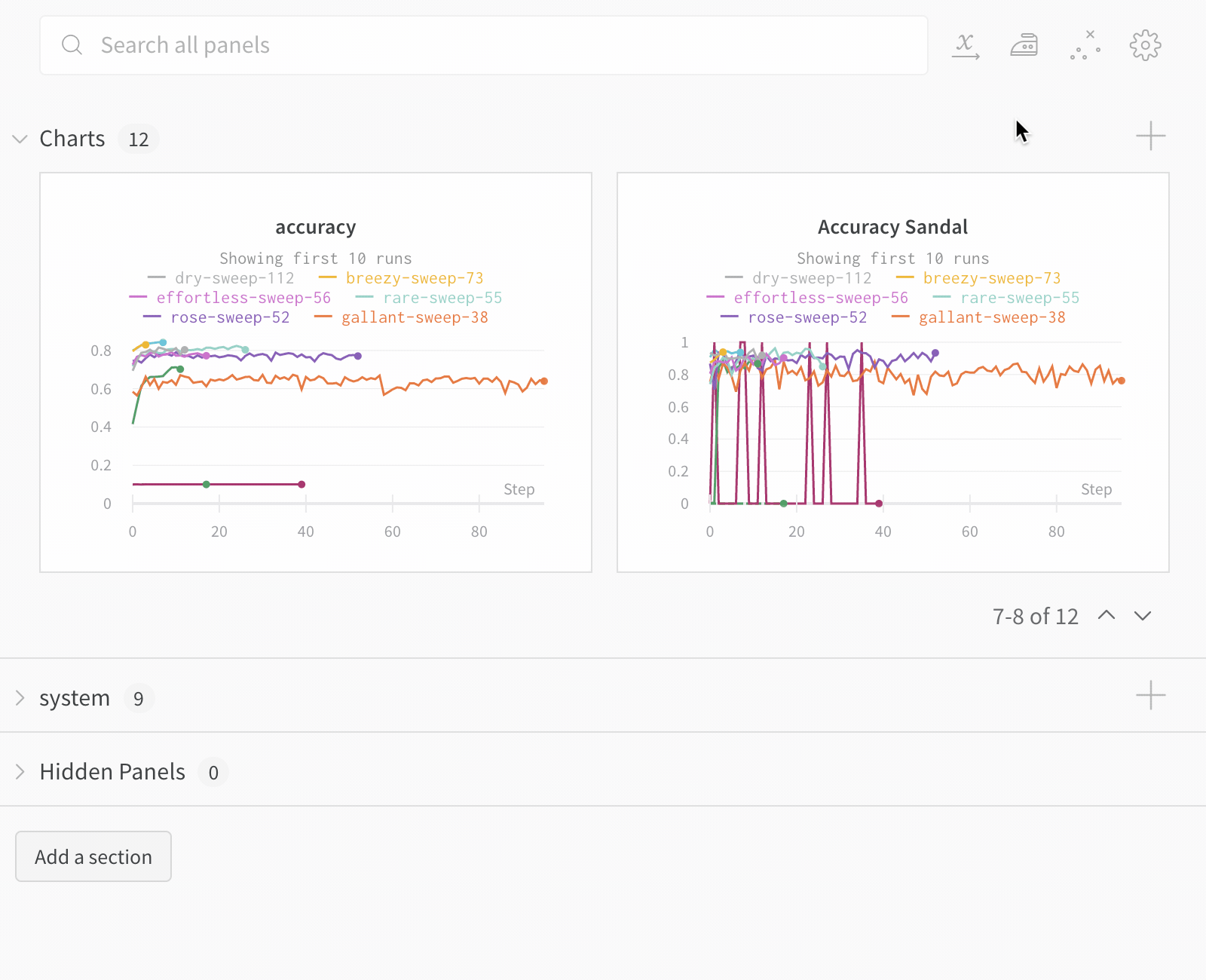 - ソート: 最小の損失や最大の精度など、runをソートする値を選択。ソートにより、グラフに表示されるrunが変わります。
