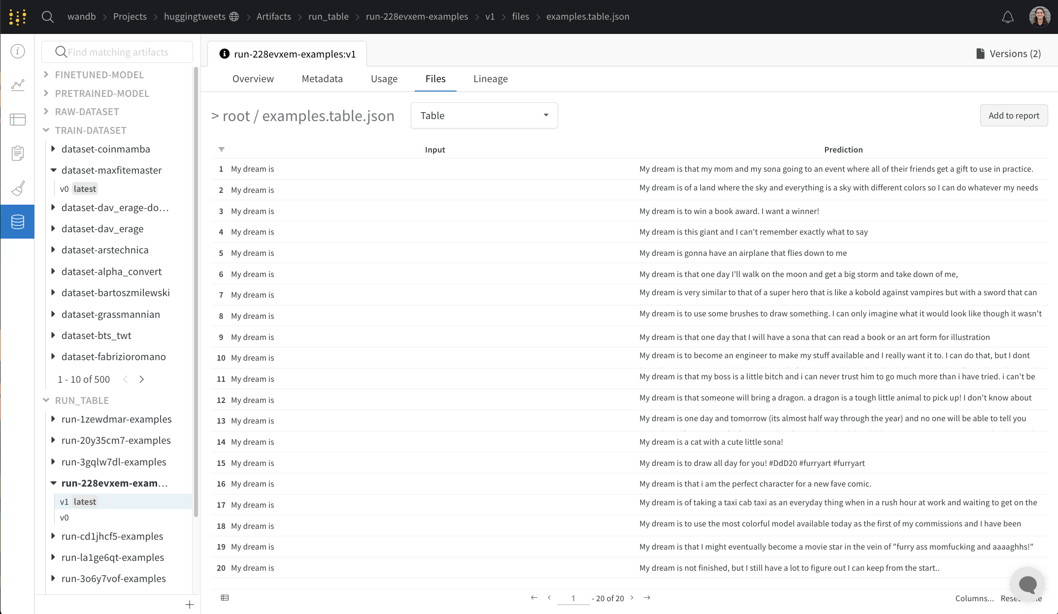 トレーニングデータセットやファインチューン済みモデル、メトリクスやメディアのテーブルからプロジェクトに関連するすべてのartifactsを表示します。