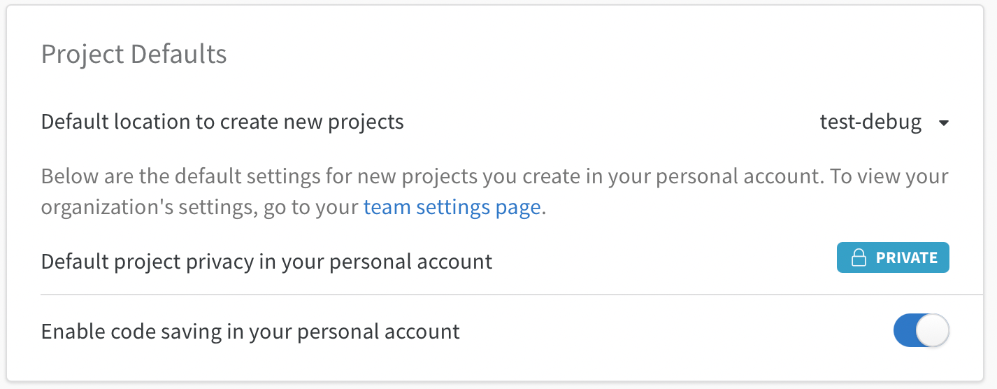 - 新しいプロジェクトを作成するデフォルトの場所: デフォルトでは、個人のエンティティに設定されています。ドロップダウンをクリックして、個人のエンティティと所属チームの間で切り替えることができます。