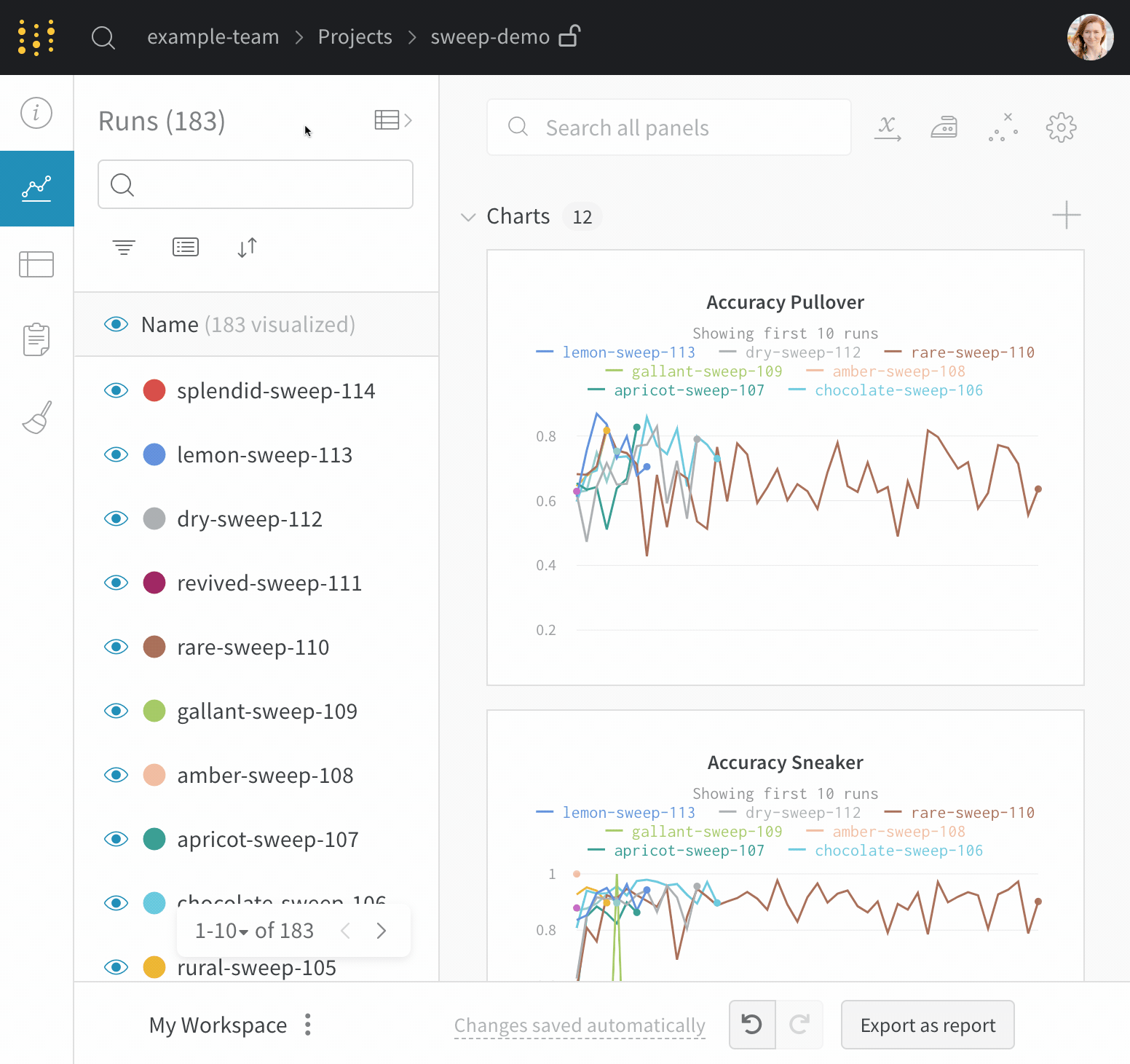 - Runカウント: 括弧内の数字はプロジェクト内のrunの総数です。(N visualized)の数字は、目のアイコンがオンになっており、各プロットで可視化可能なrunの数です。以下の例では、グラフには183runのうちの最初の10runのみが表示されています。グラフを編集して表示されるrunの最大数を増やします。
