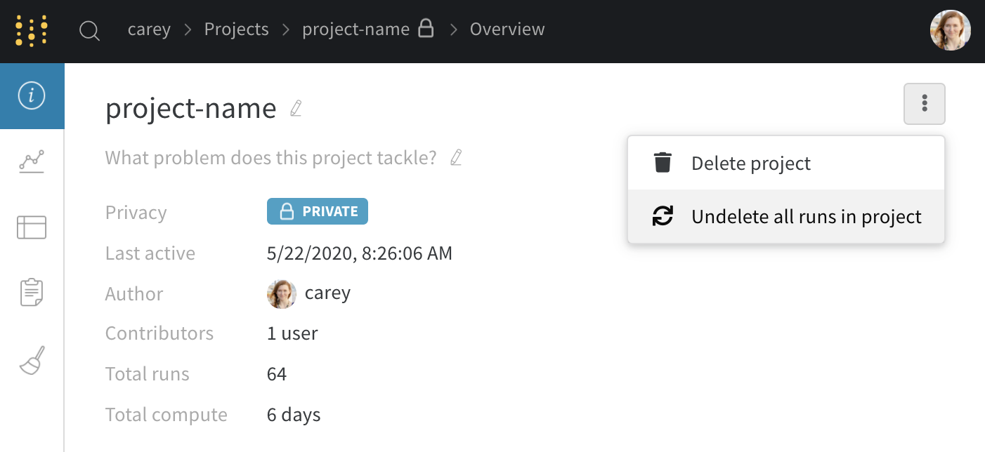 プロジェクトが空(つまりrunがない)場合は、右上のドロップダウンメニューをクリックして「プロジェクトを削除」を選択して削除できます。