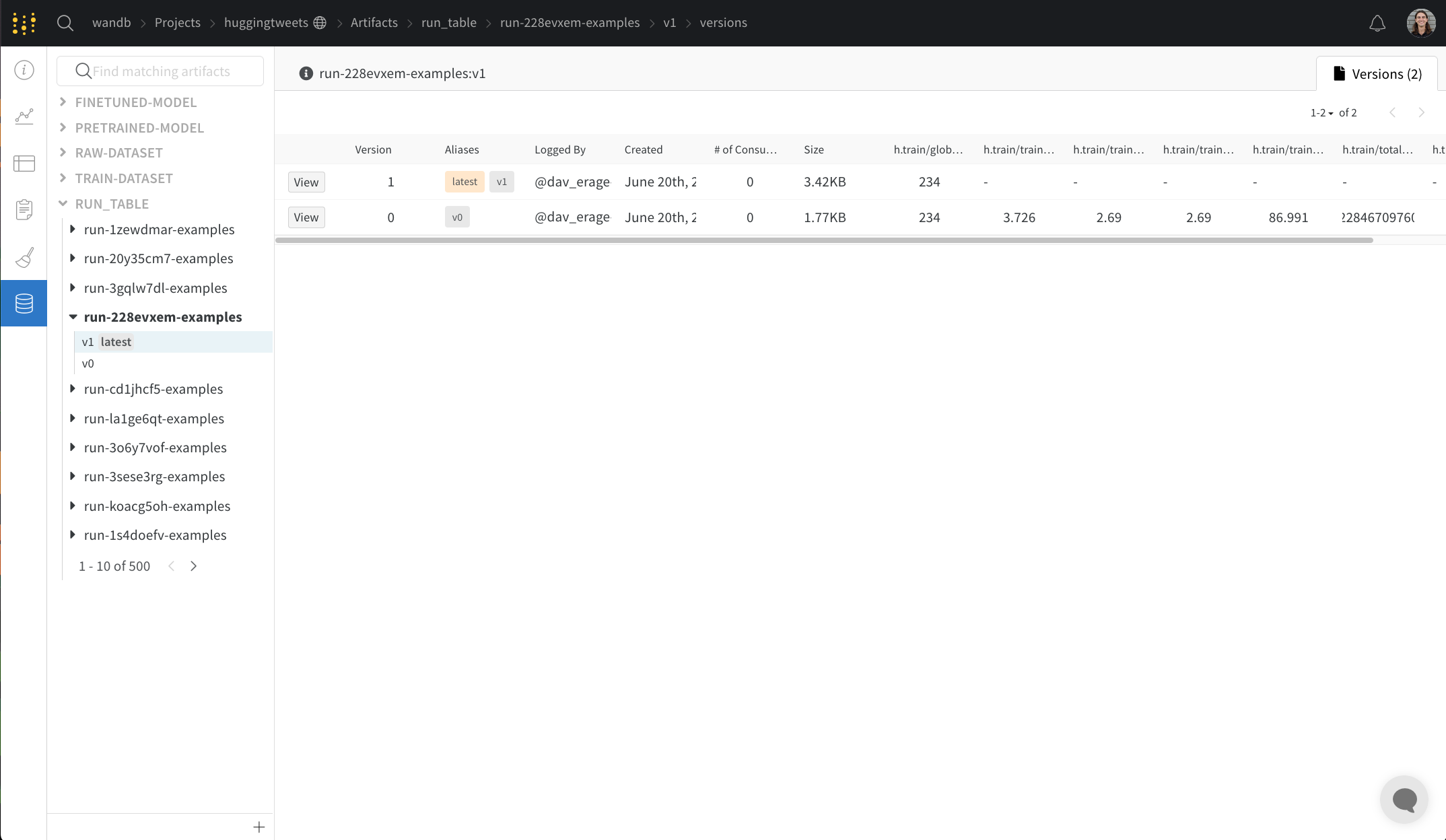 バージョンタブでは、アーティファクトのすべてのバージョンと、バージョンをログした時点でのRun Historyの各数値の列が表示されます。これにより、パフォーマンスを比較し、関心のあるバージョンを迅速に特定できます。