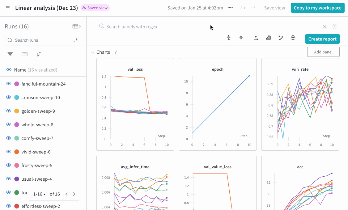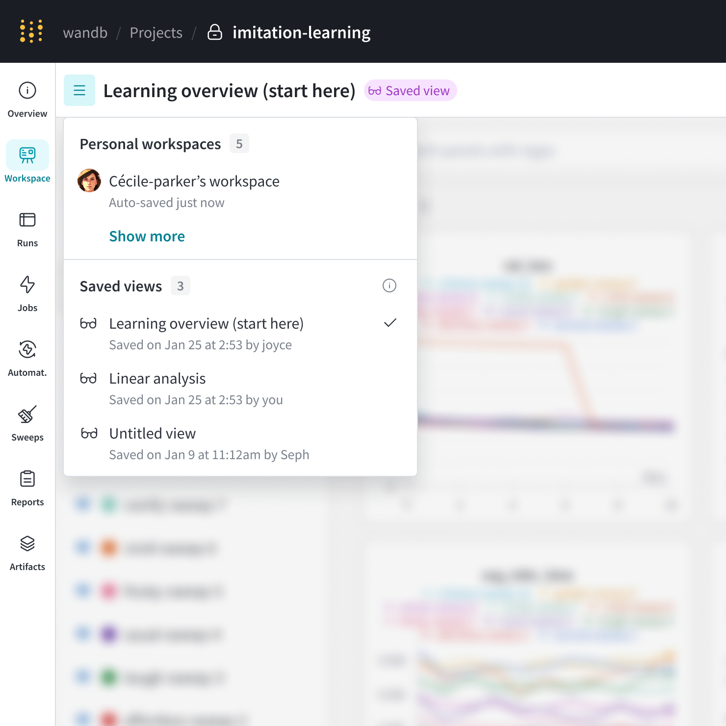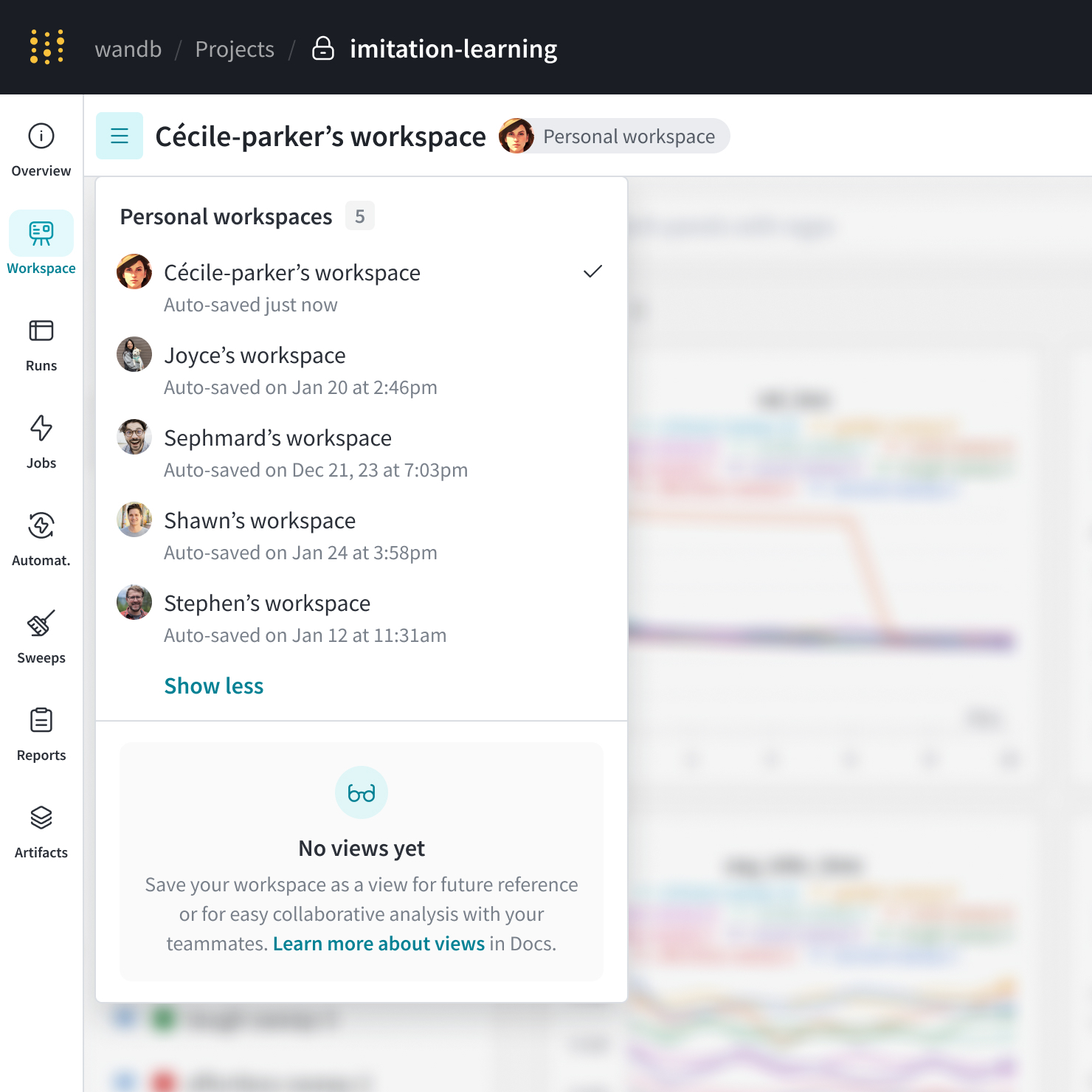 - Saved views: ワークスペースの共同スナップショットです。チームの誰もが、保存されたワークスペースビューを閲覧、編集、および変更を保存できます。保存されたワークスペースビューを使用して、実験、run などをレビューし、議論します。