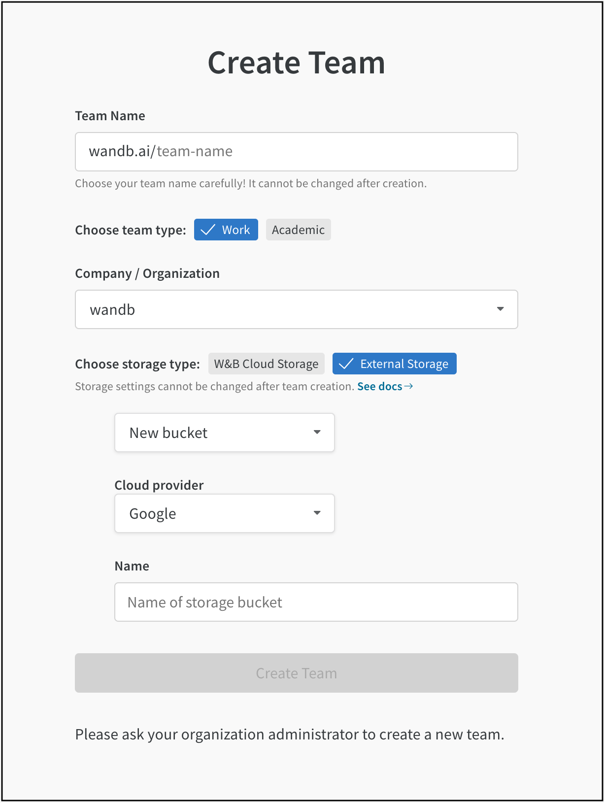 W&B Teamを作成する際に、チームレベルでクラウドストレージバケットを設定します: