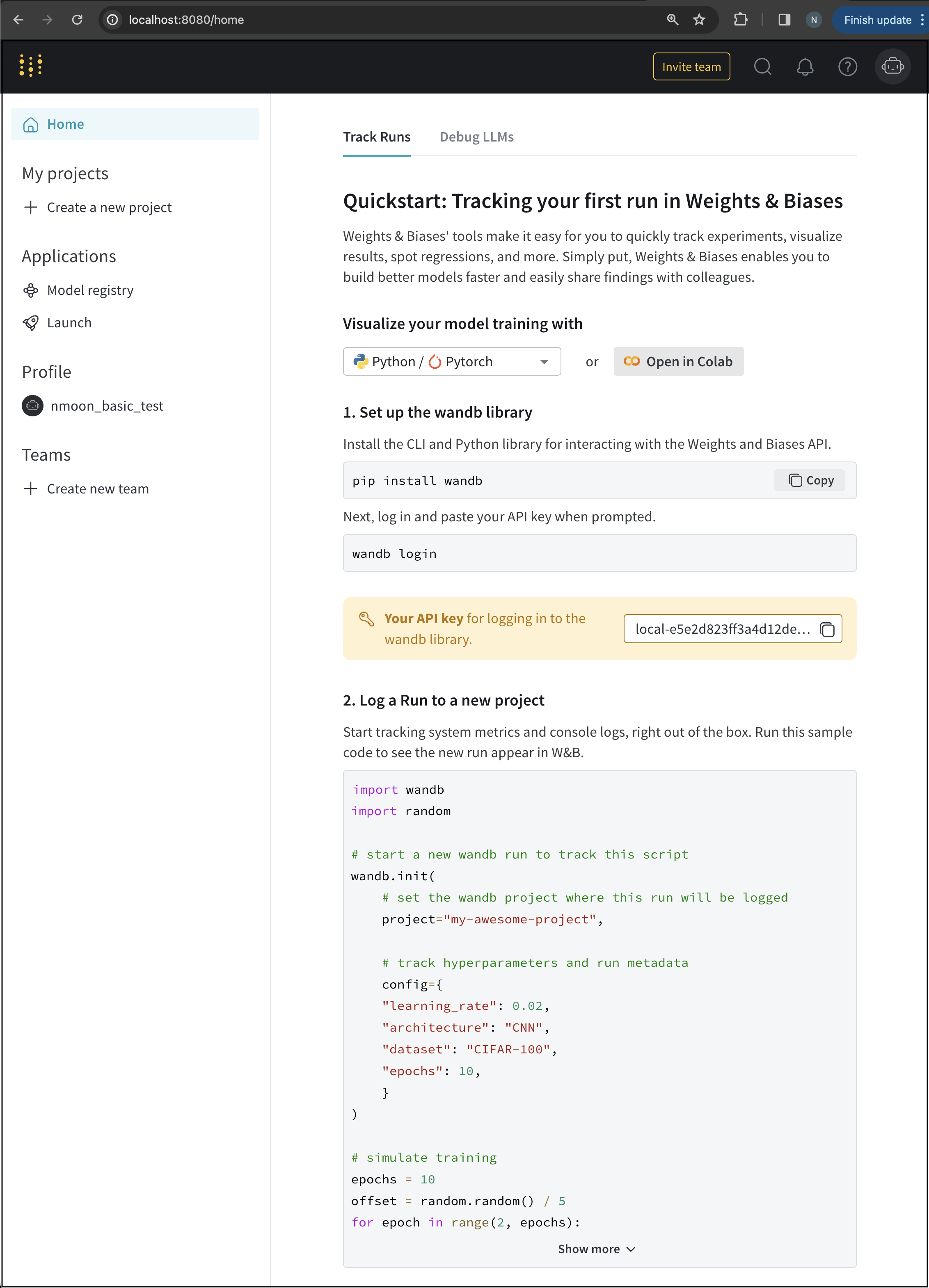 ローカルマシンでW&Bが実行されていることを確認します。http://localhost:8080/home に移動します。ブラウザにW&BアプリUIが表示されるはずです。