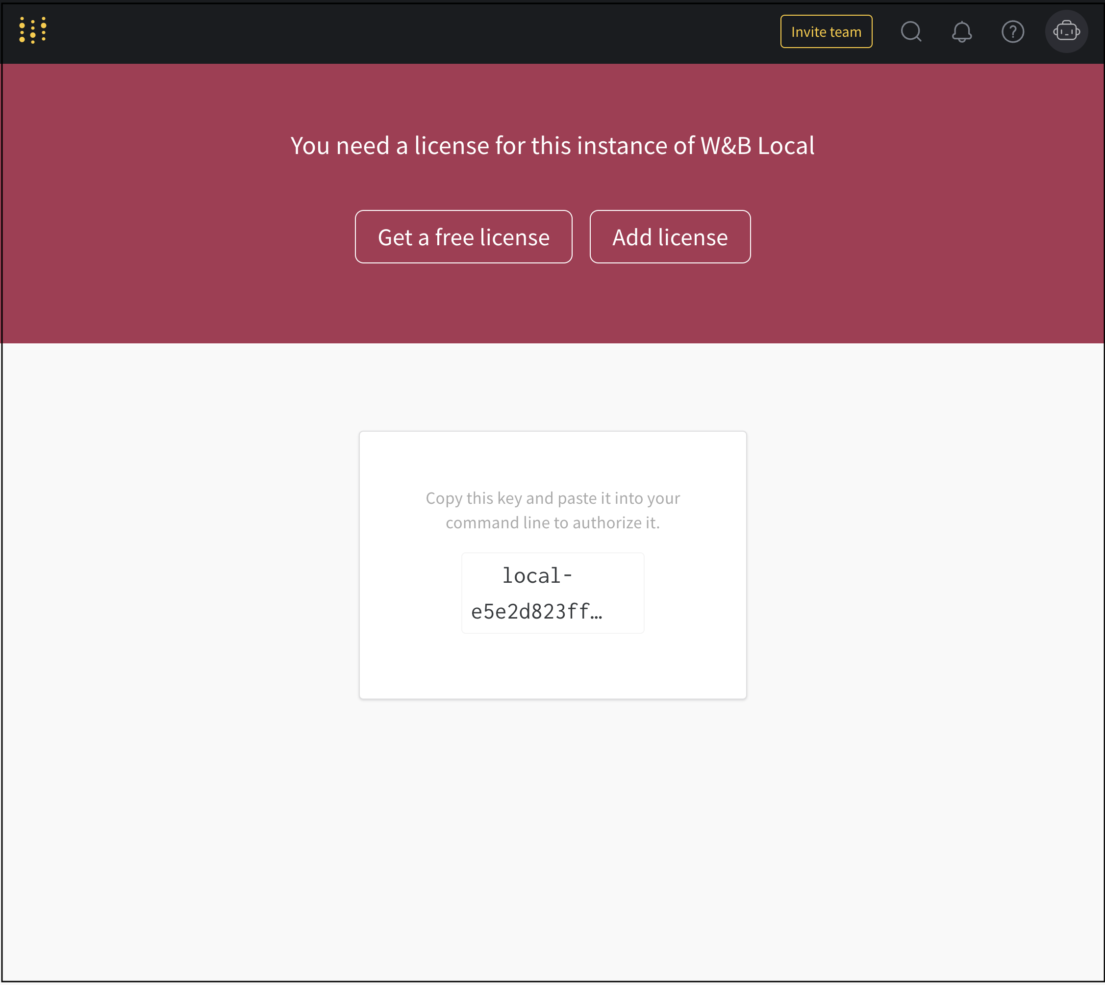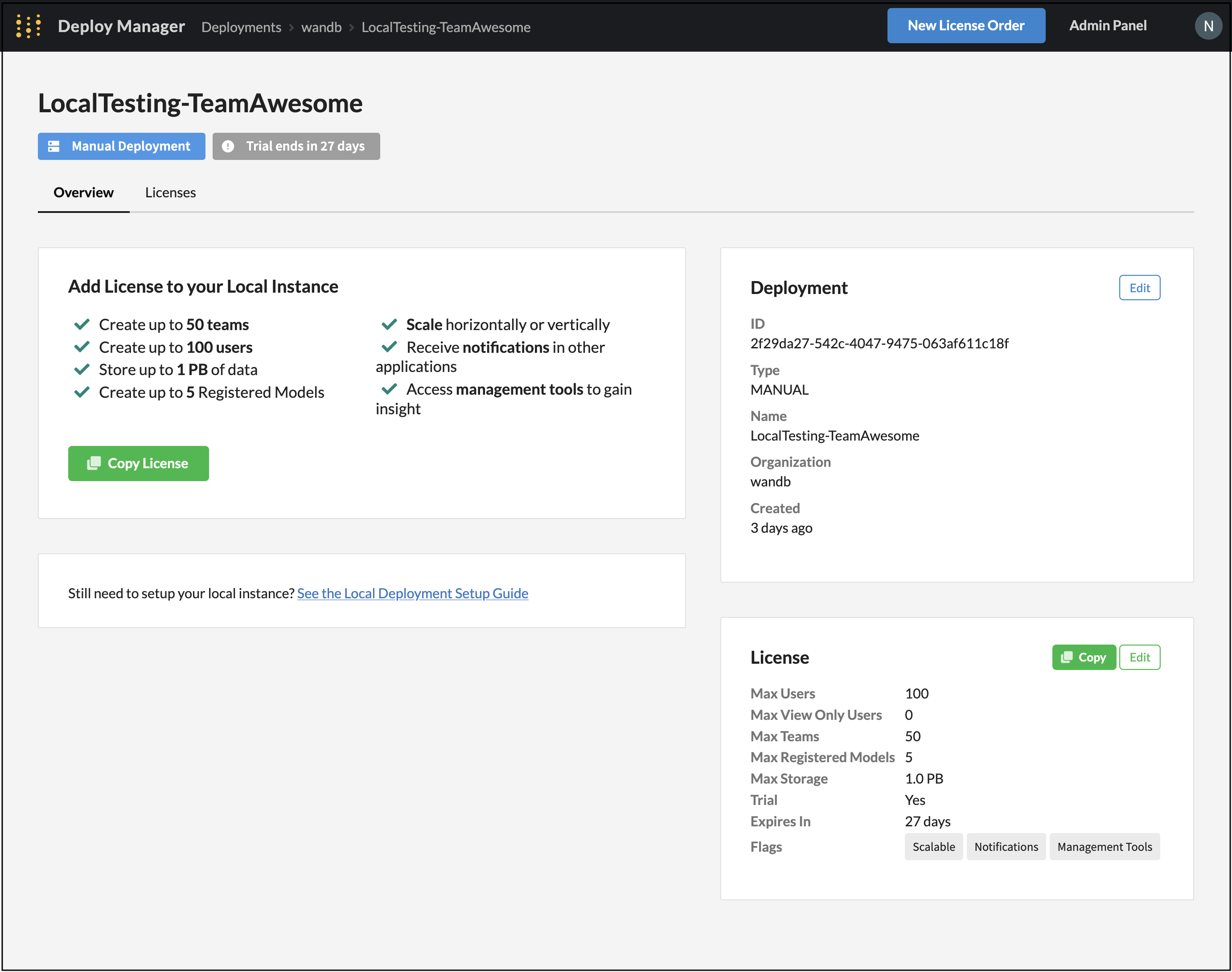Generate License Key をクリックすると、W&Bはデプロイメントライセンスページにリダイレクトします。デプロイメントライセンスページでは、デプロイメントIDやライセンスが所属する組織などのライセンスインスタンスに関する情報を閲覧できます。