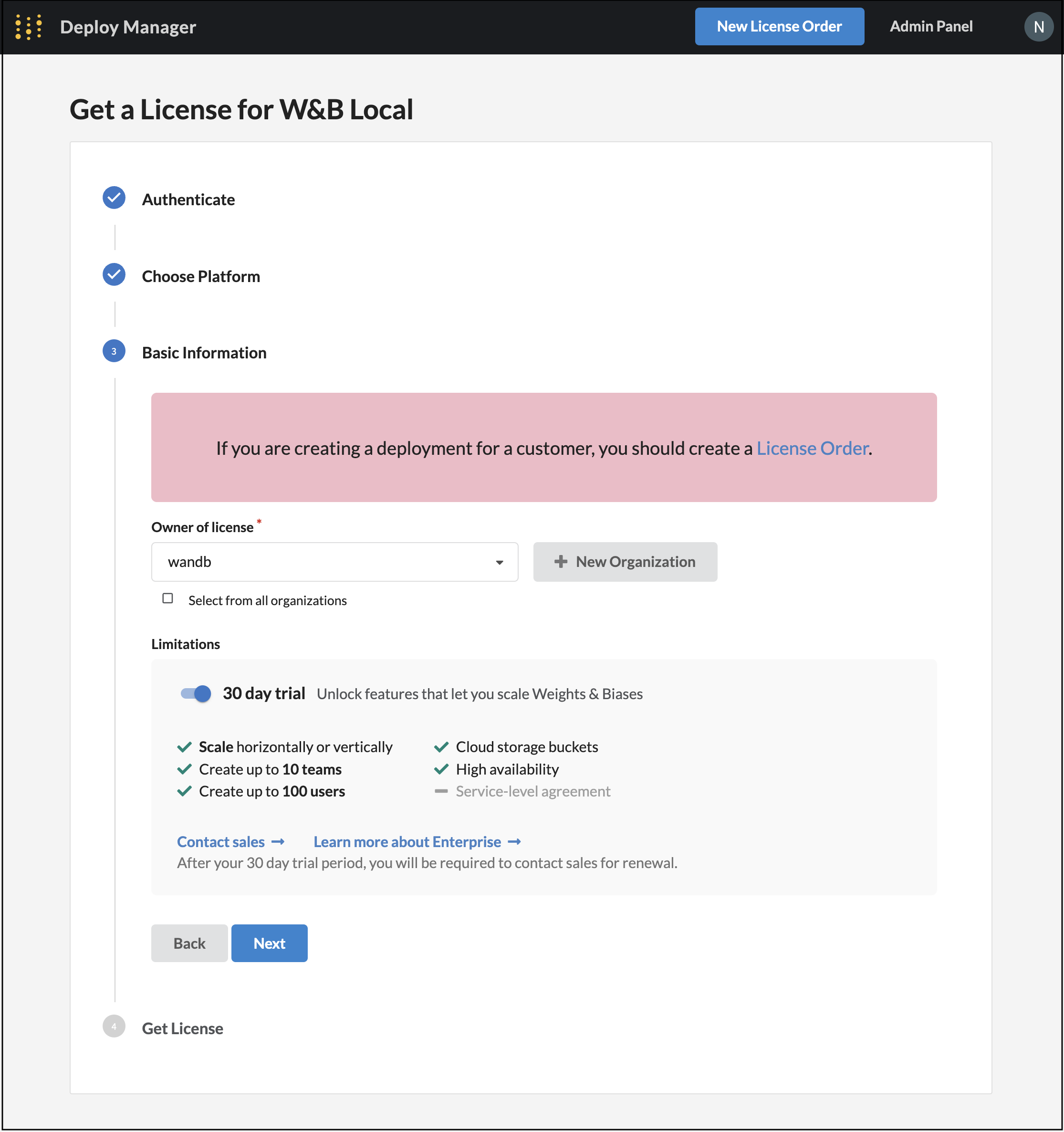 W&B Deploy Managerにアクセスしてhttps://deploy.wandb.ai/deploy でTrial Mode W&Bライセンスを生成します。