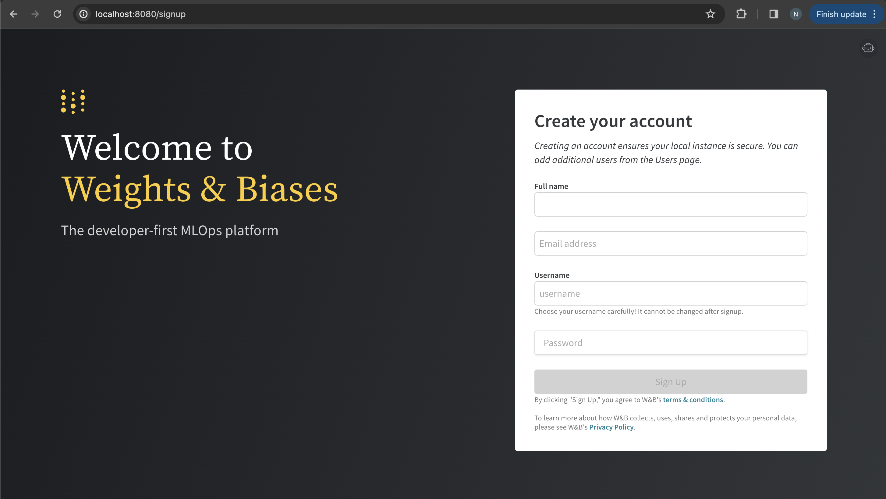 http://localhost:8080/signup に移動し、初期ユーザーアカウントを作成します。名前、メールアドレス、ユーザー名、およびパスワードを入力します:
