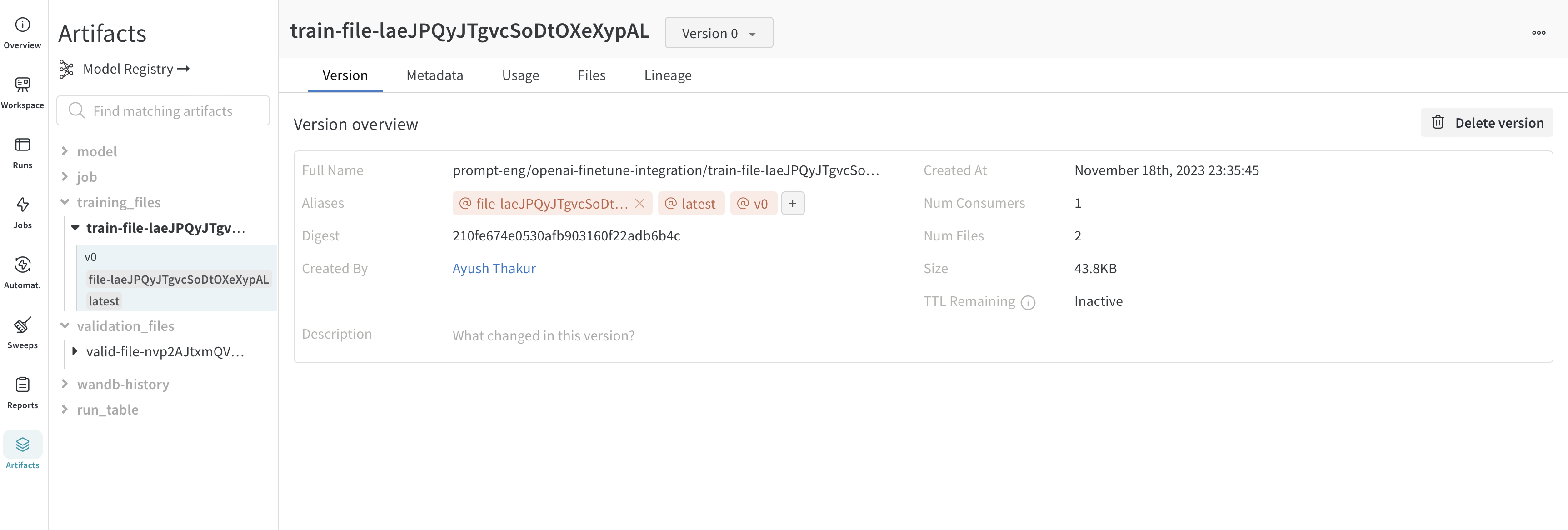 トレーニングデータと検証データは自動的に W&B にアーティファクトとしてログされます。ファインチューンされたモデルの ID を含むメタデータもアーティファクトとしてログされます。