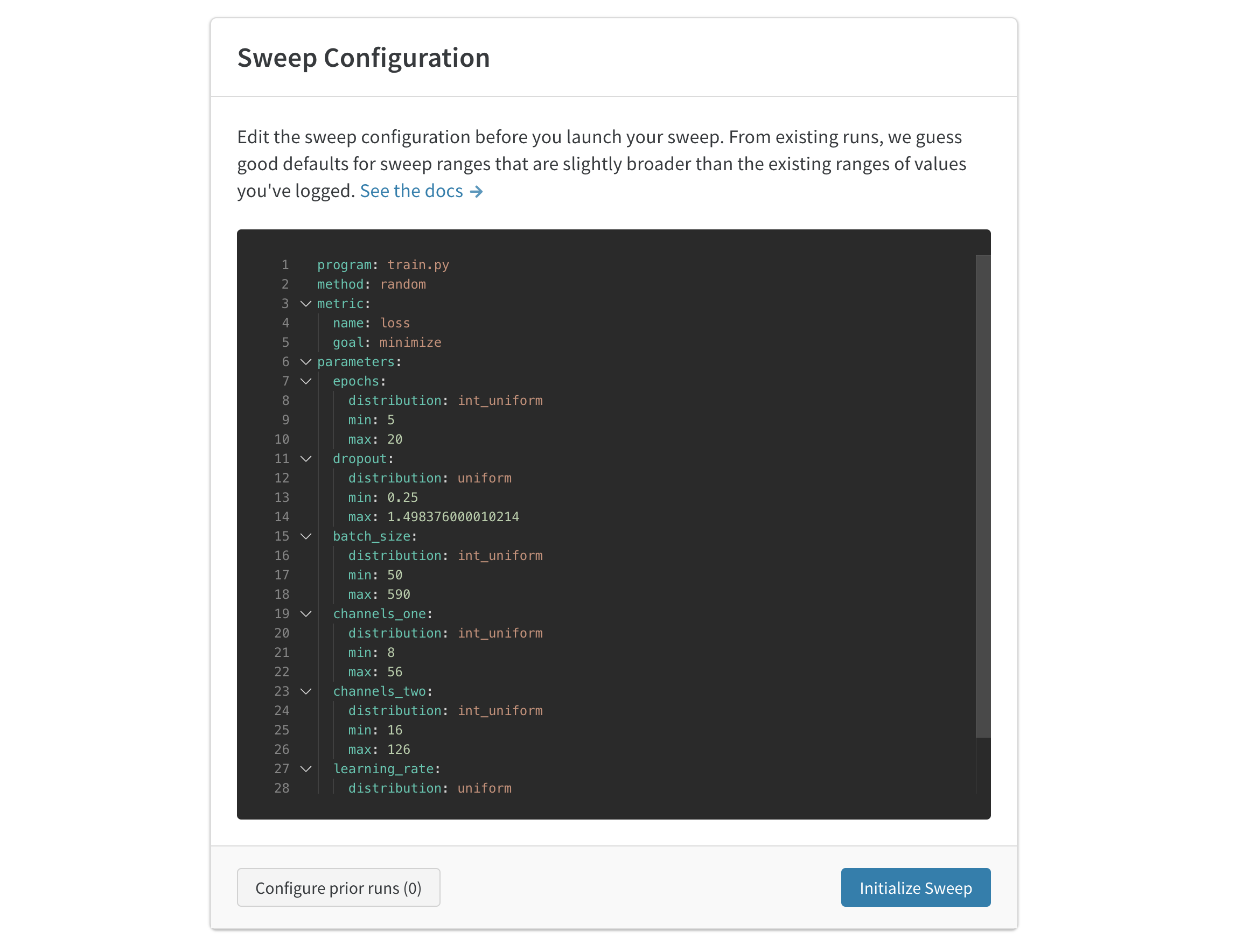 自動生成された設定は、実行した run に基づいて Sweeps する値を推測します。設定を編集して、試したいハイパーパラメーターの範囲を指定します。sweep を開始すると、ホストされている W&B sweep server 上に新しいプロセスが開始されます。この集中型サービスは、トレーニングジョブを実行しているエージェント(マシン)を調整します。