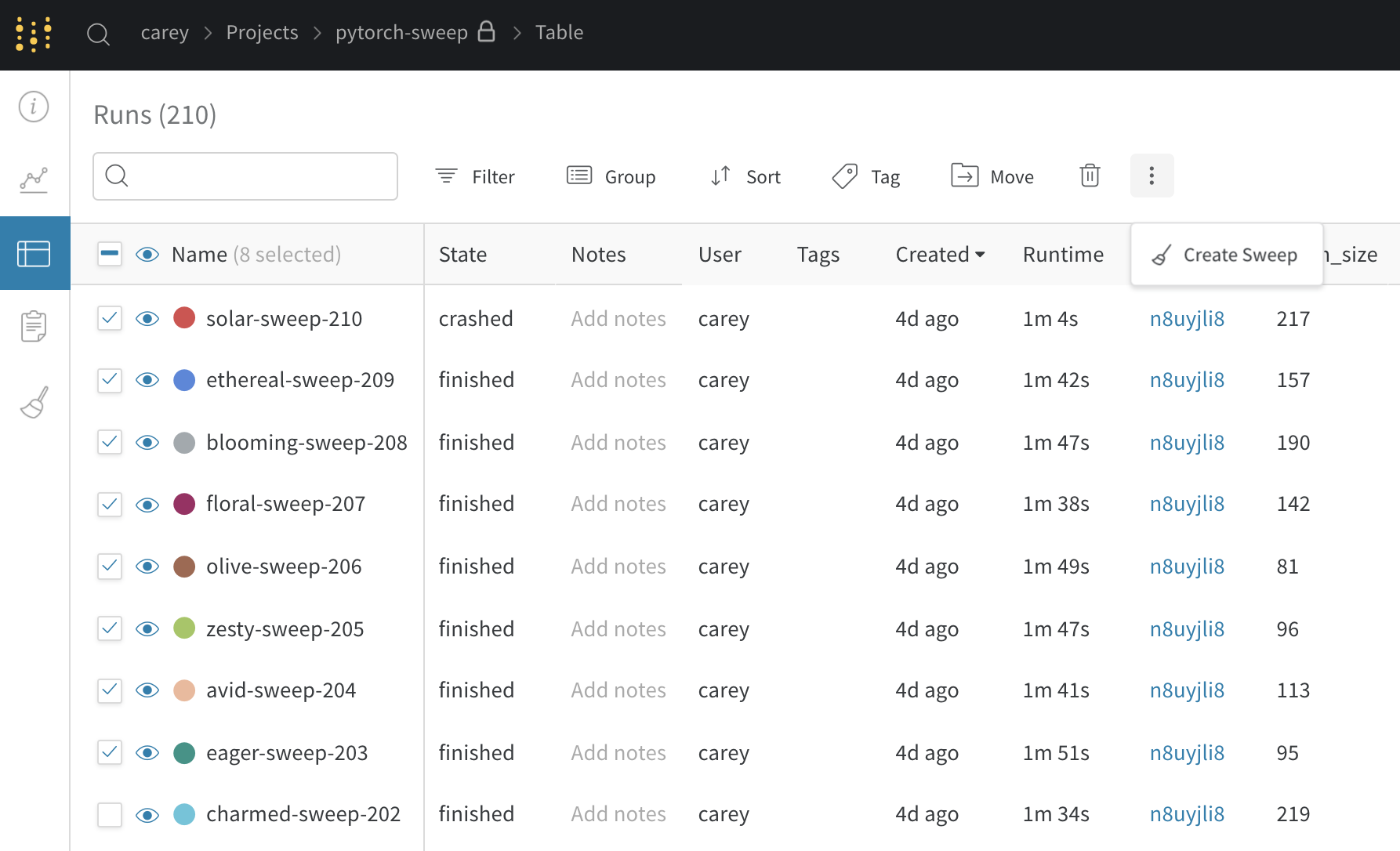 これで Sweep を実行している状態です。以下の画像は、例の Sweep ジョブが実行されているときのダッシュボードの様子を示しています。例のプロジェクトページを見る →