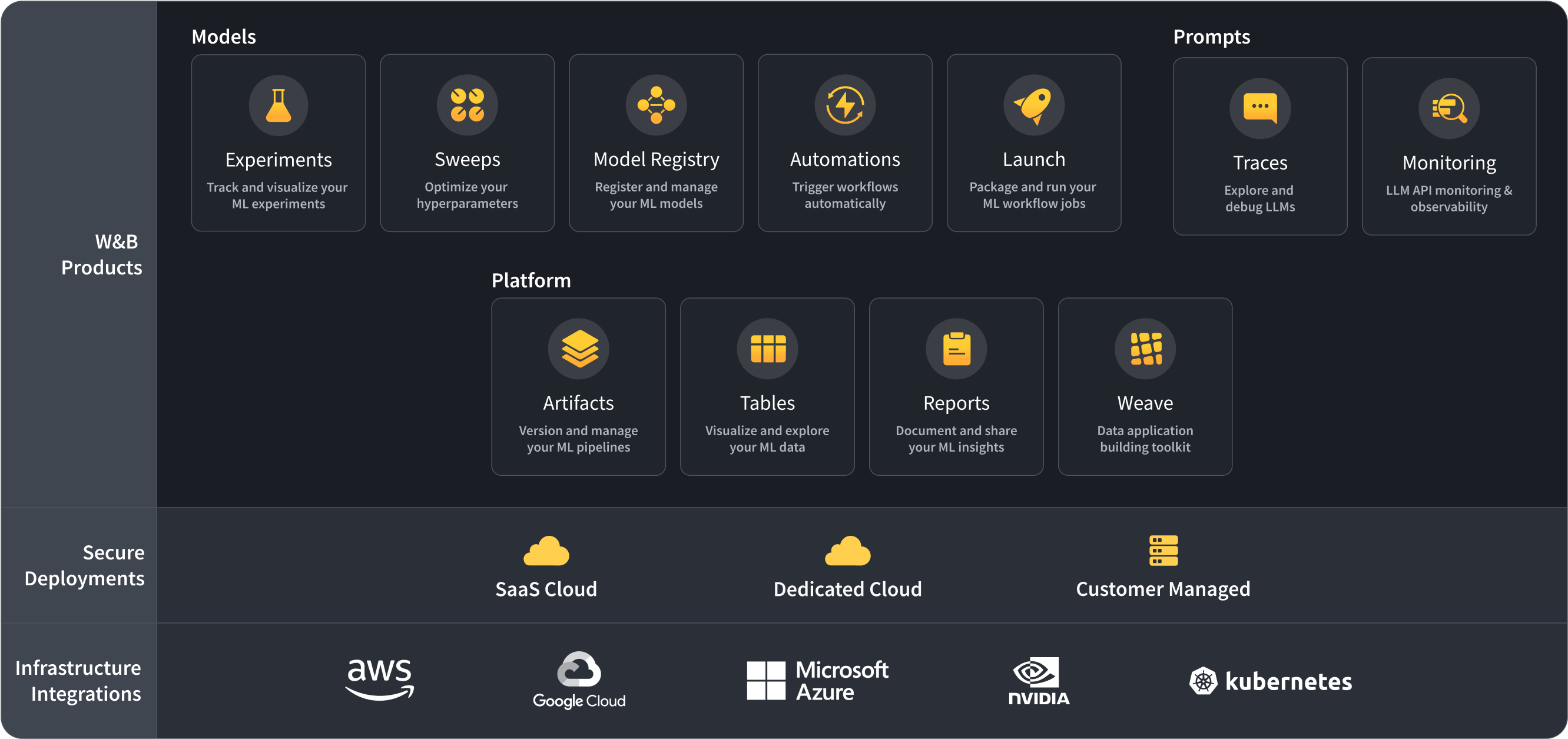 이 다이어그램은 W&B 제품 간의 관계를 간략하게 설명합니다.