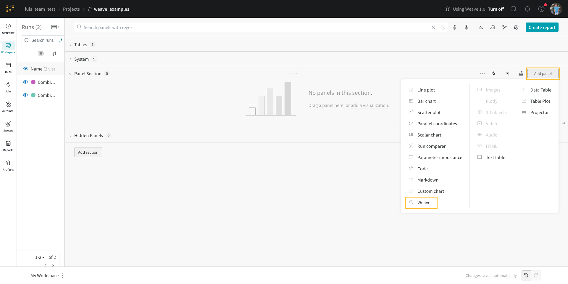 /weave를 입력하고Weave를 선택하여 독립적인 Weave 패널을 추가하세요.