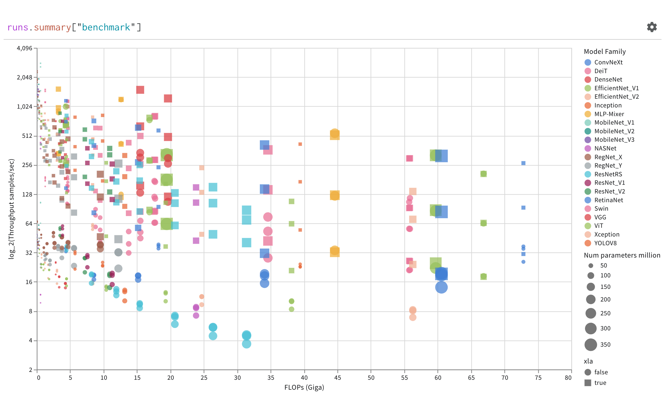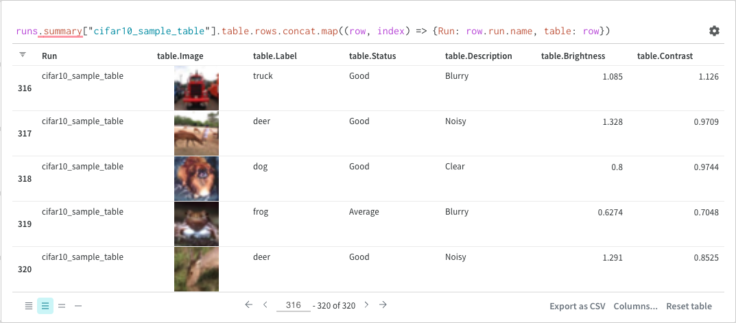 runs는 워크스페이스에 있는 Weave 패널 식에서 자동으로 주입되는 변수입니다. 그 "값"은 해당 워크스페이스에서 볼 수 있는 실행 목록입니다. 실행 내에서 사용할 수 있는 다양한 속성에 대해 여기서 읽어보세요.summary는 실행의 요약 객체를 반환하는 op입니다. 주의: ops는 "매핑"되며, 이 op는 목록의 각 실행에 적용되어 요약 객체 목록을 생성합니다.["cifar10_sample_table"]는 Pick op(대괄호로 표시됨)로, "predictions"의 파라미터를 가집니다. 요약 객체가 사전이나 맵처럼 작동하기 때문에, 이 연산은 각 요약 객체에서 "predictions" 필드를 "선택"합니다.