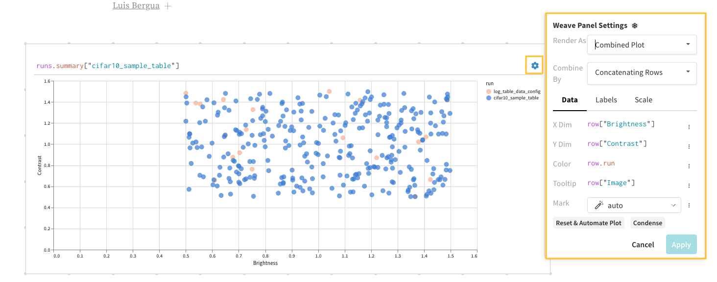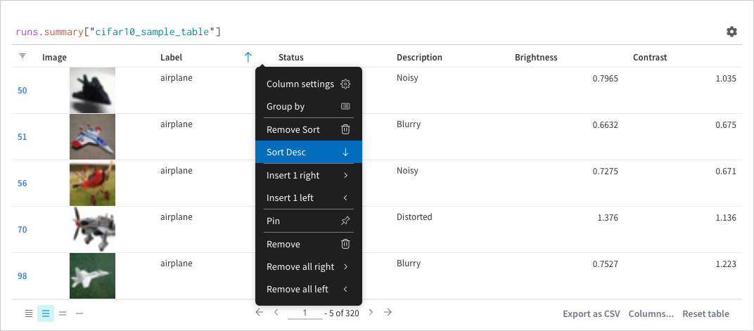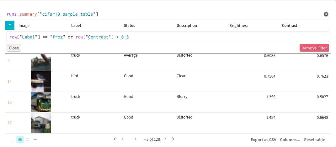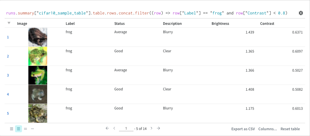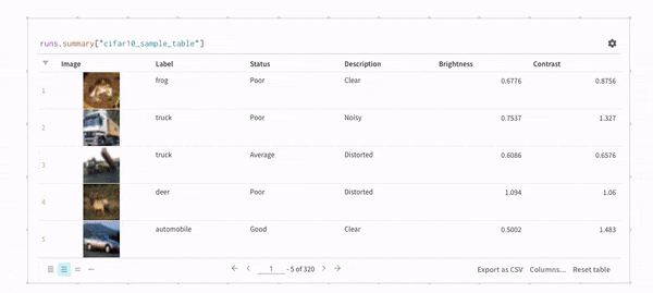 Weave 식은 사용자가 W&B에 저장된 데이터를 쿼리할 수 있게 해줍니다 - 실행부터 아티팩트, 모델, 테이블 등에 이르기까지. wandb.log({"cifar10_sample_table":<MY_TABLE>})으로 테이블을 로그할 때 생성할 수 있는 일반적인 Weave 식: