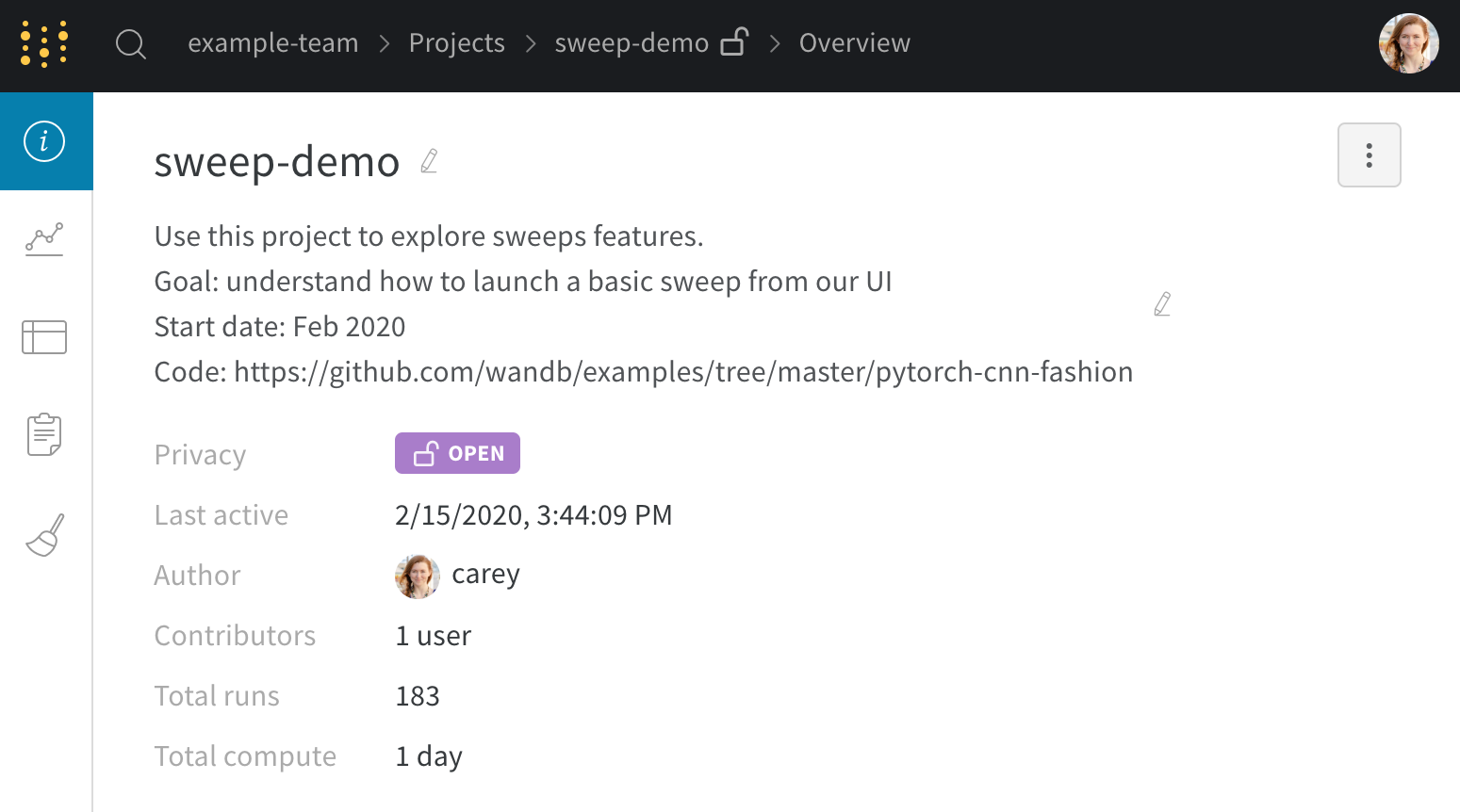 프로젝트에서 새로운 sweep을 시작하세요.