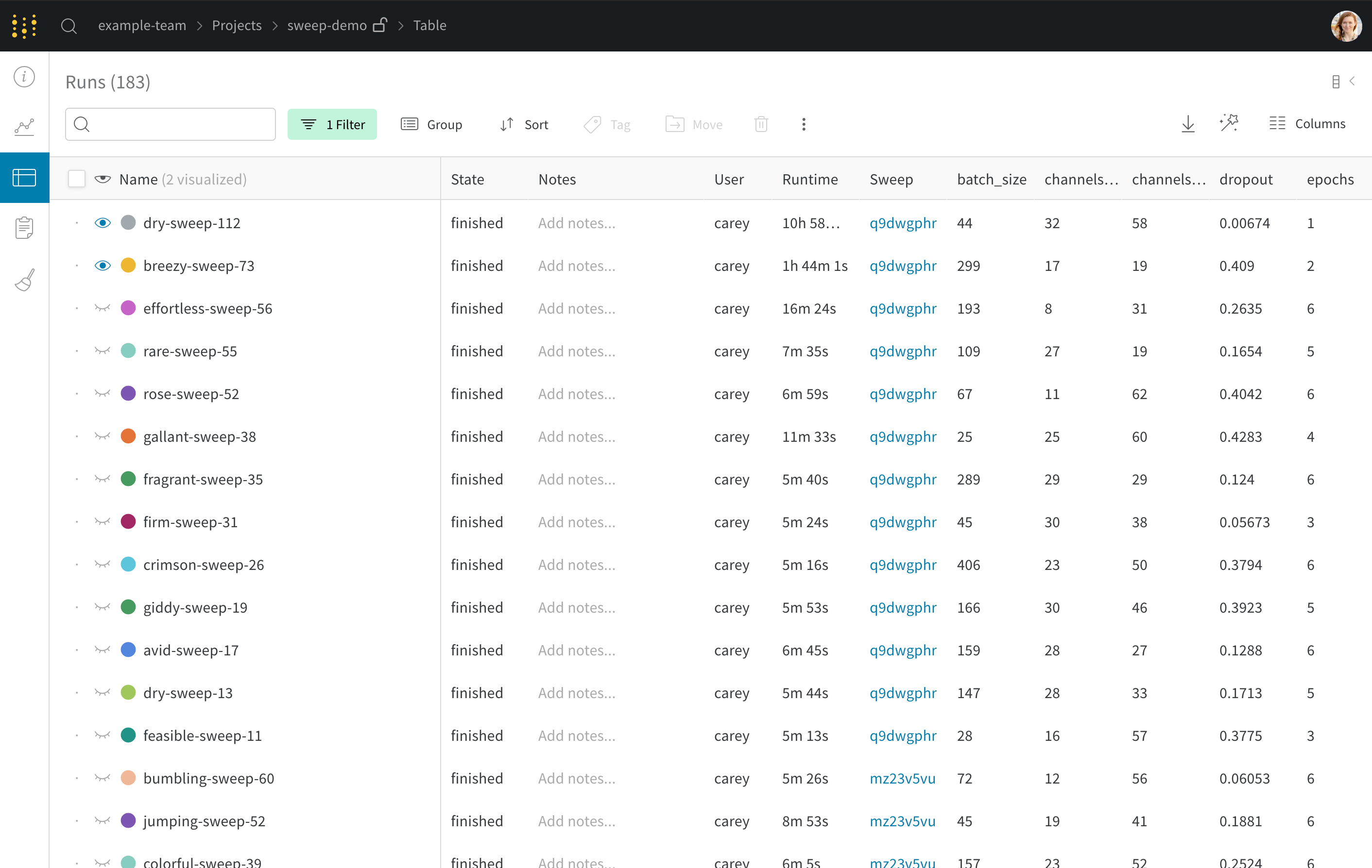 W&B 앱을 사용하여 W&B 테이블을 정렬, 필터링 및 그룹화하세요.