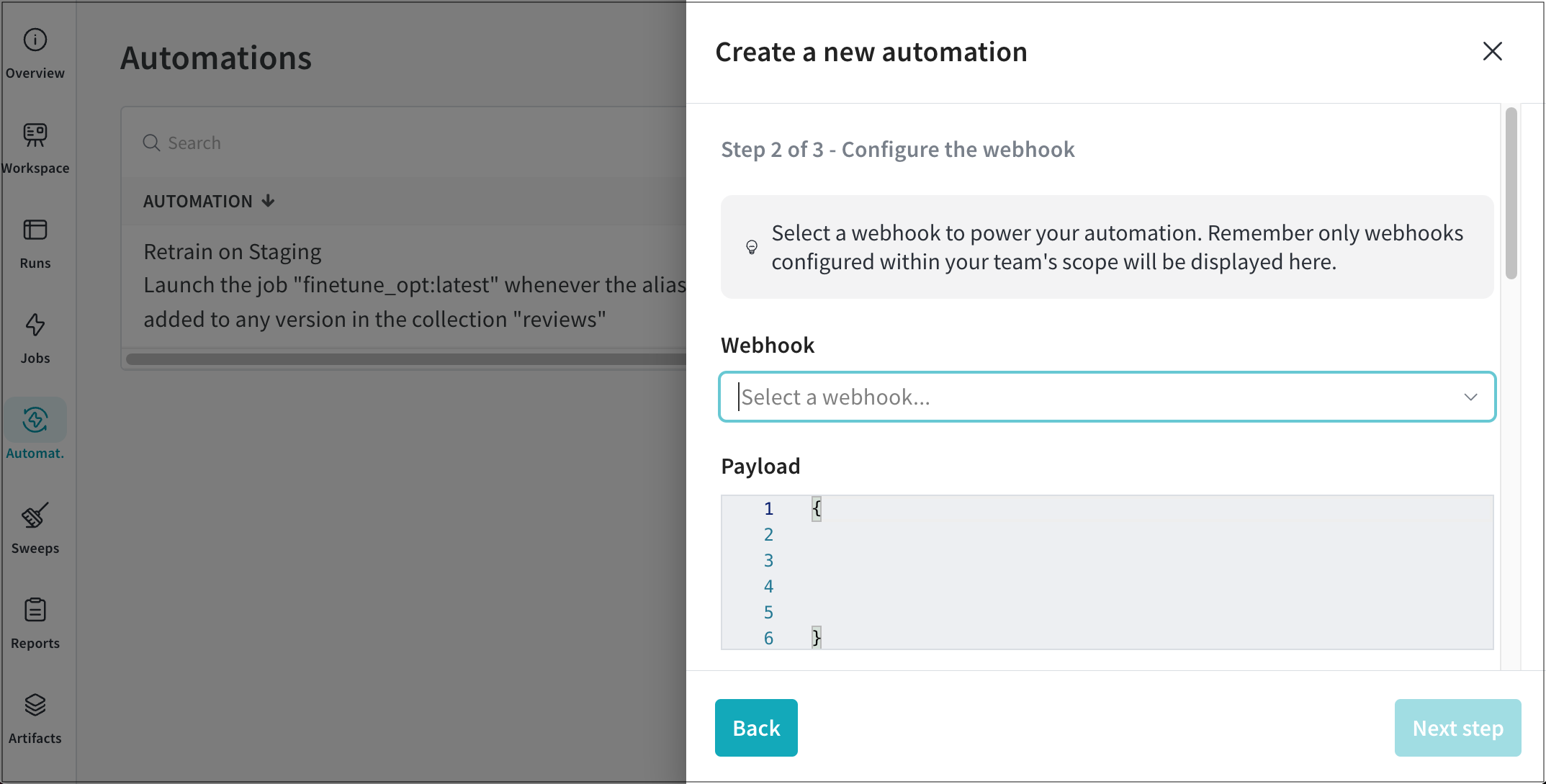 W&B App UI를 사용하여 액션을 기반으로 웹훅을 자동화하십시오. 이를 위해 먼저 웹훅을 설정한 다음 웹훅 자동화를 구성합니다.