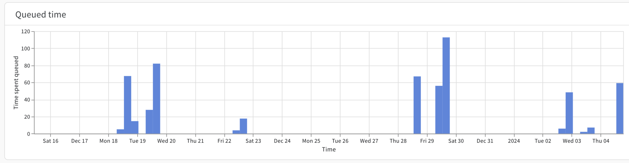 큐 대기 시간 차트는 주어진 날짜 또는 시간 범위 동안 실행 job이 큐에 있었던 시간(초 단위)을 보여줍니다.