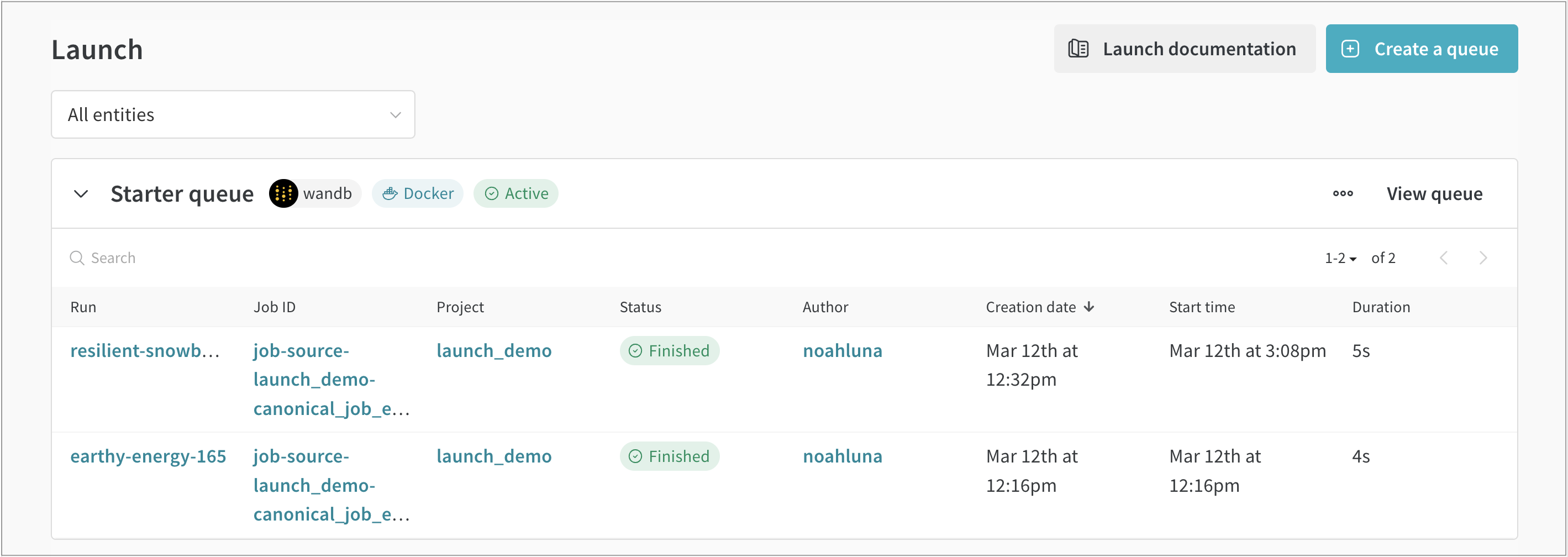 예를 들어, 다음 이미지는 job-source-launch_demo-canonical이라는 job에서 생성된 두 개의 run을 보여줍니다. Job은 Start queue라는 큐에 추가되었습니다. 큐에서 나열된 첫 번째 run은 resilient-snowball이고 두 번째 run은 earthy-energy-165입니다.