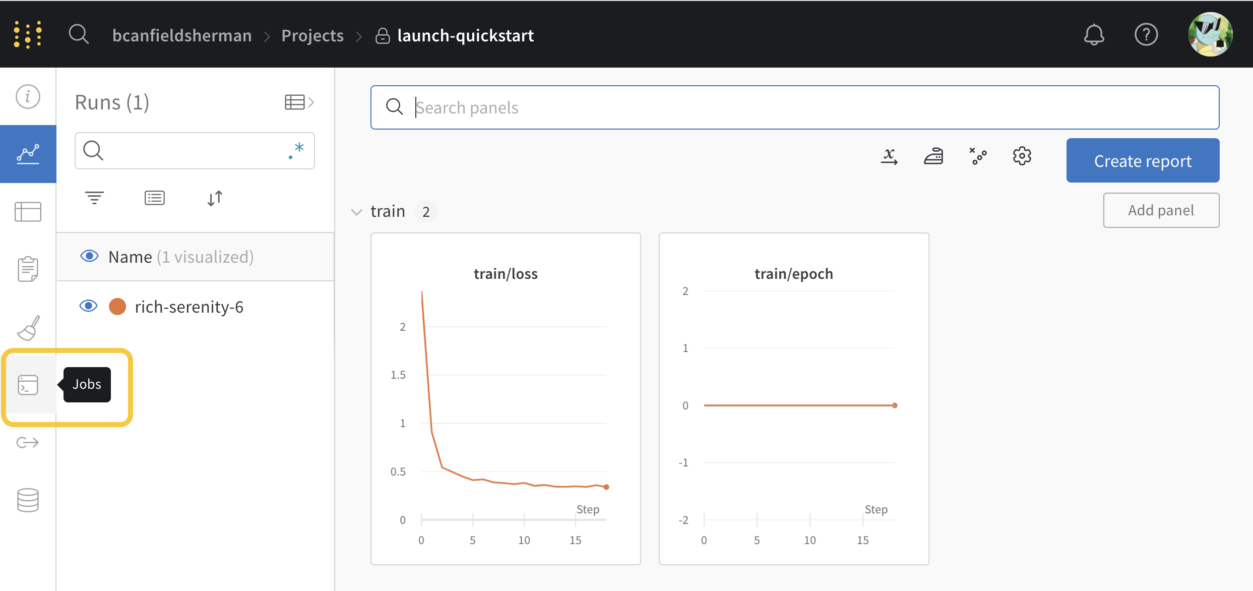 W&B 계정에서 새로운 launch-quickstart 프로젝트로 이동하여 화면 왼쪽의 탐색에서 jobs 탭을 엽니다.