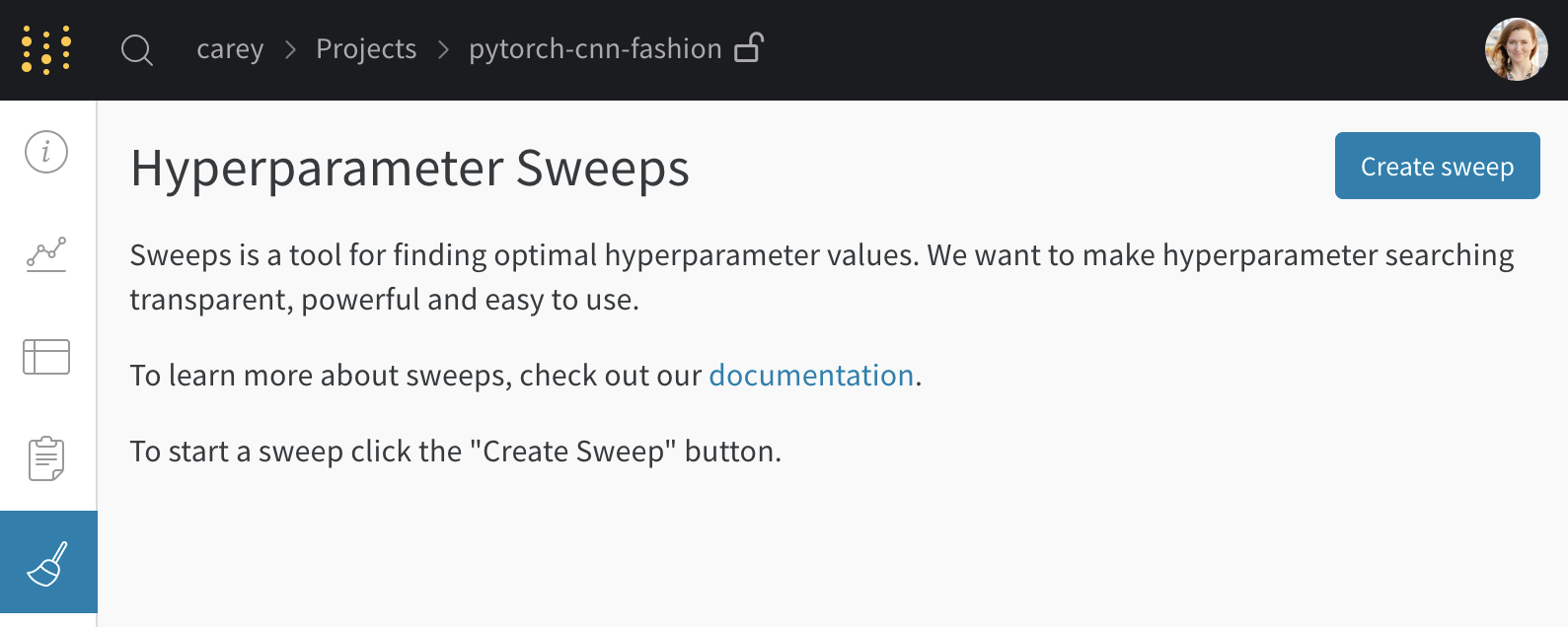 프로젝트 페이지에서 사이드바의 Sweep 탭을 열고 Create Sweep을 선택하세요.